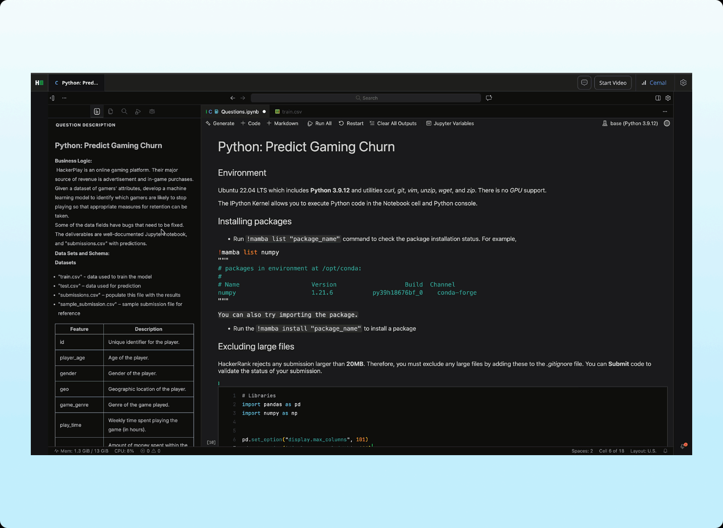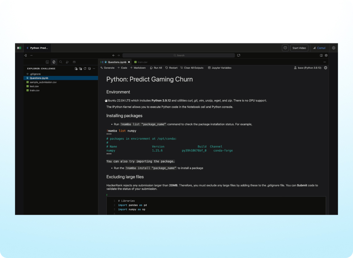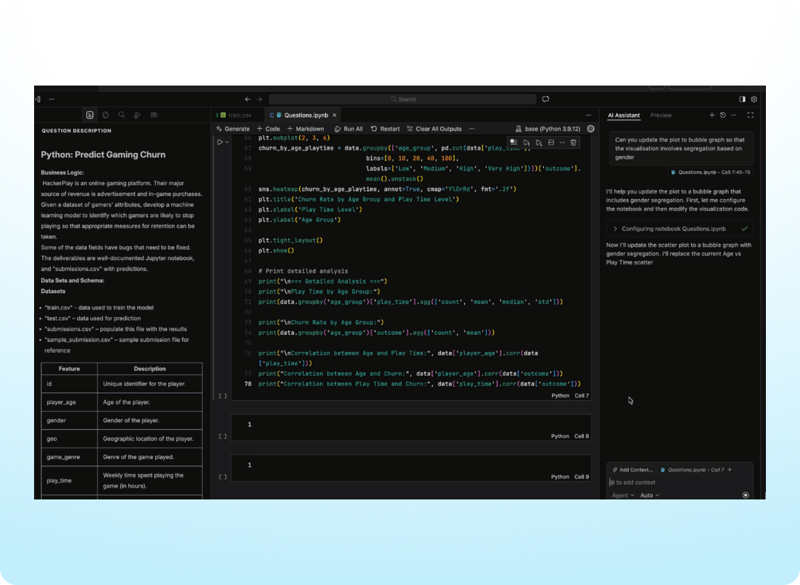 Data science candidates now complete assessments in Visual Studio Code (VS Code), the same professional coding environment they would use on the job. This update provides a more consistent experience across roles, while still supporting notebook-based work with AI help for exploring data and reviewing code.