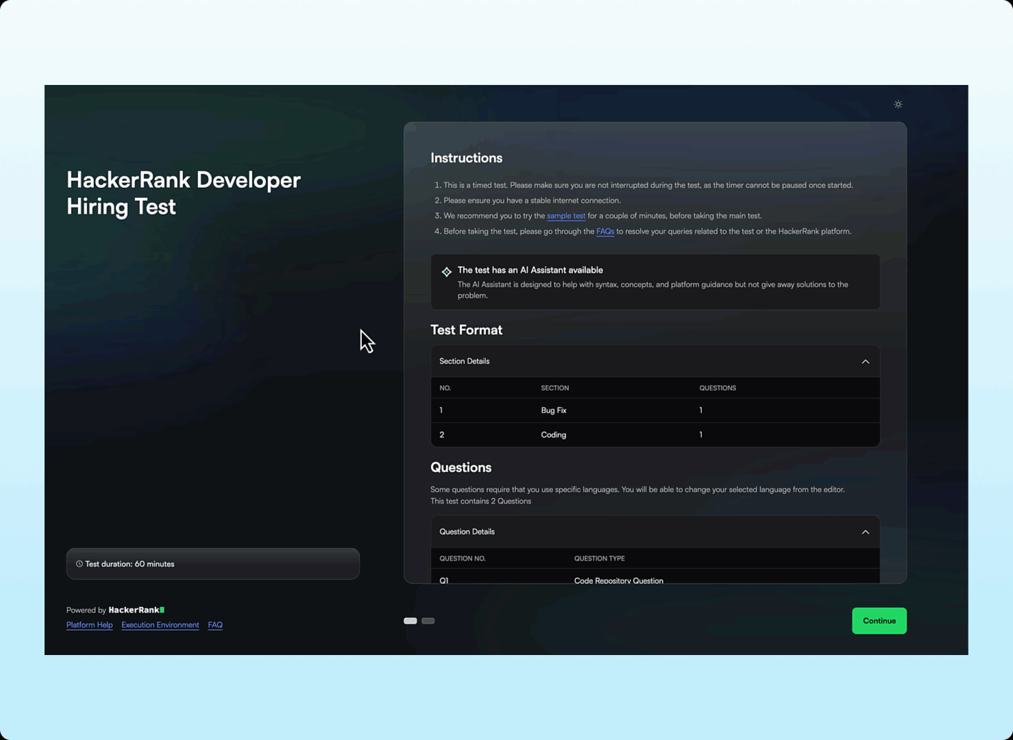 The candidate experience has been refreshed with a cleaner interface and simpler onboarding across all question types. Candidates can get started faster with clear instructions available both before login and during the test.