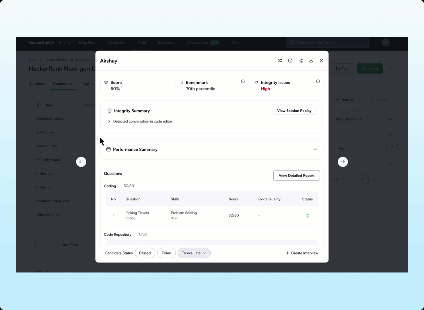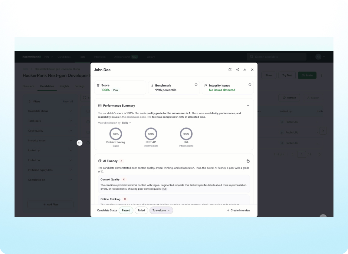 Focus on meaningful results and evaluate candidates fairly and consistently with performance signals designed to reduce visual bias and improve clarity. Scores and code quality signals are clearly surfaced in the performance summary and benchmark percentiles and scores below the cutoff are no longer color coded.