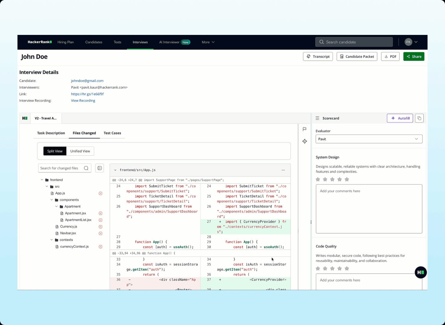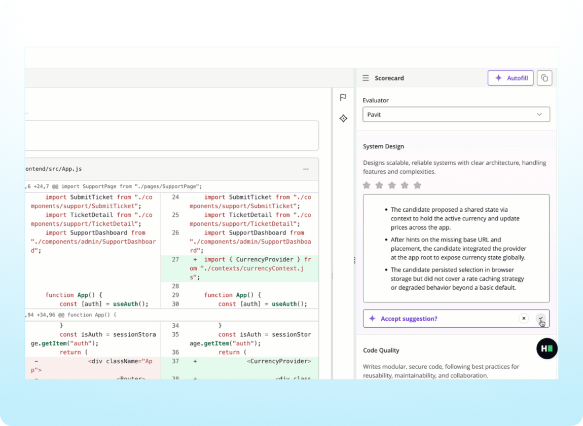 Complete interview scorecards faster with auto-populated summaries based on the candidate’s performance and interview transcript. Scorecard Assist is now available for interviews with project and code repository questions and helps you quickly deliver consistent, high-quality feedback across interviews.