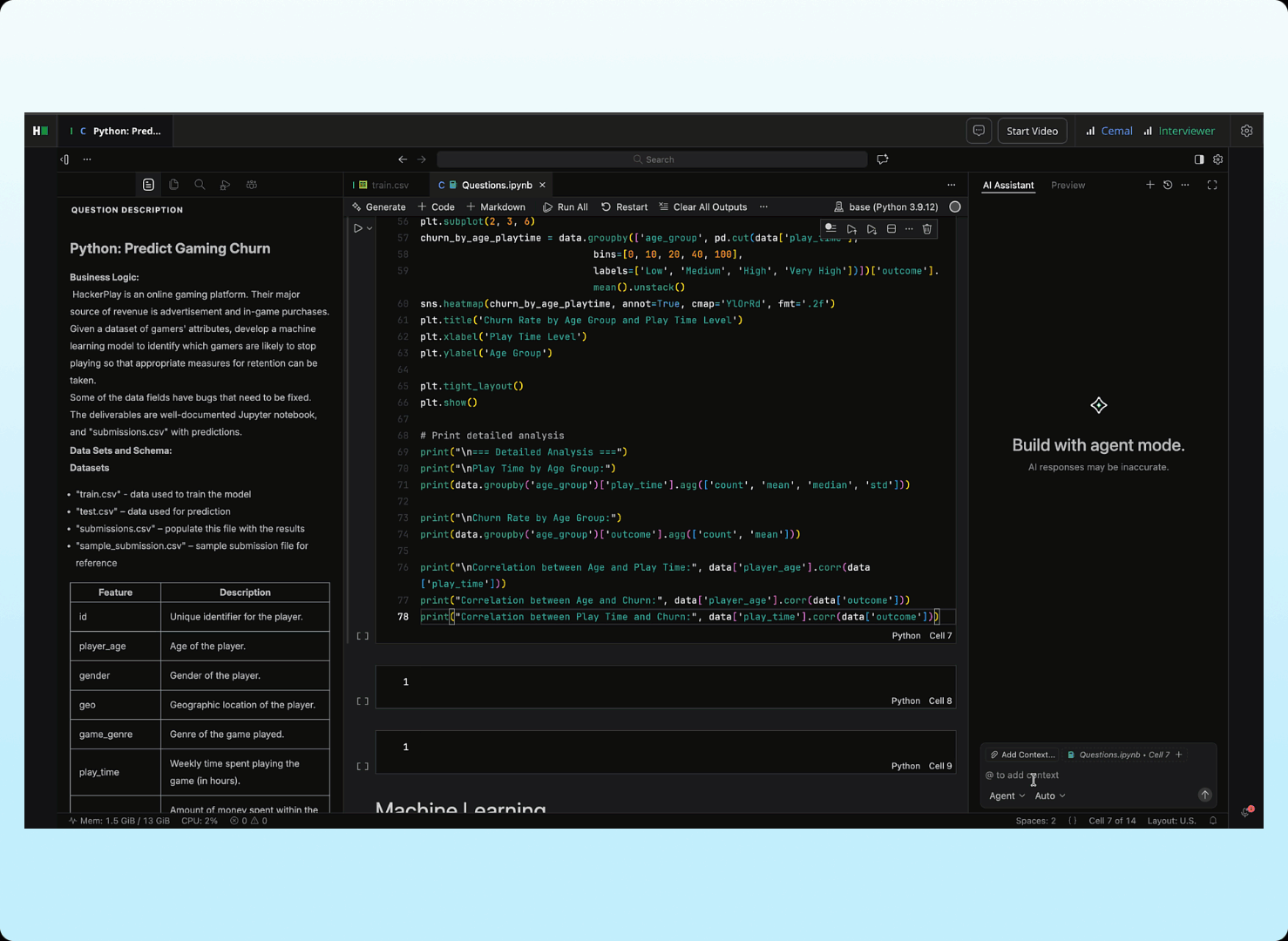 Interviewers can see how data science candidates use AI in real time to explore data, debug code, and build solutions, revealing their problem-solving approach, judgment, and practical AI skills. AI Assistant capabilities are now available for data science questions in interviews with VS Code, supporting chat and agent modes within notebooks.