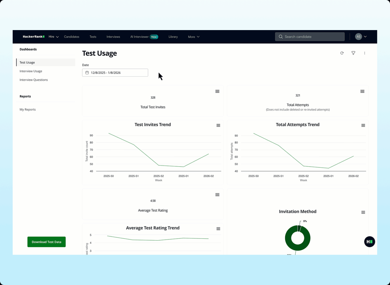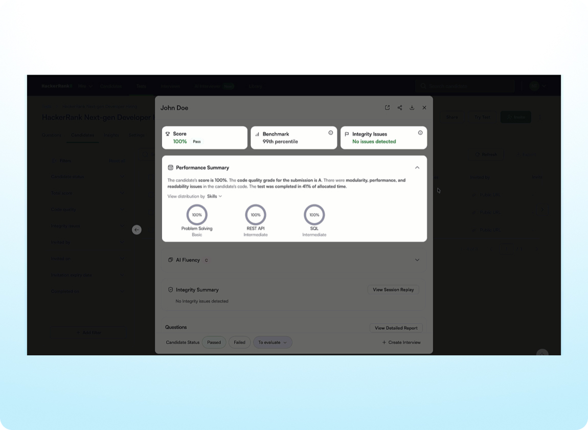 Gain deeper insight into each test attempt with a new AI Fluency grade in the Summary Report, helping you assess how candidates use AI to solve real-world challenges. Benchmarks have been refreshed with 2025 data, and report performance has been improved for faster review.