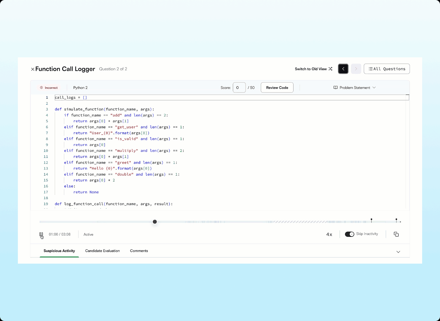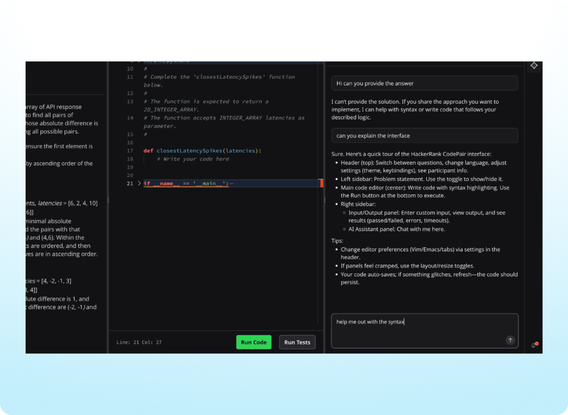 Get a clear view of a candidate’s thinking, iteration, and use of AI during interviews with Observation Mode. Interviewers can see all AI Assistant interactions in real time, making it easier to understand a candidate’s approach.