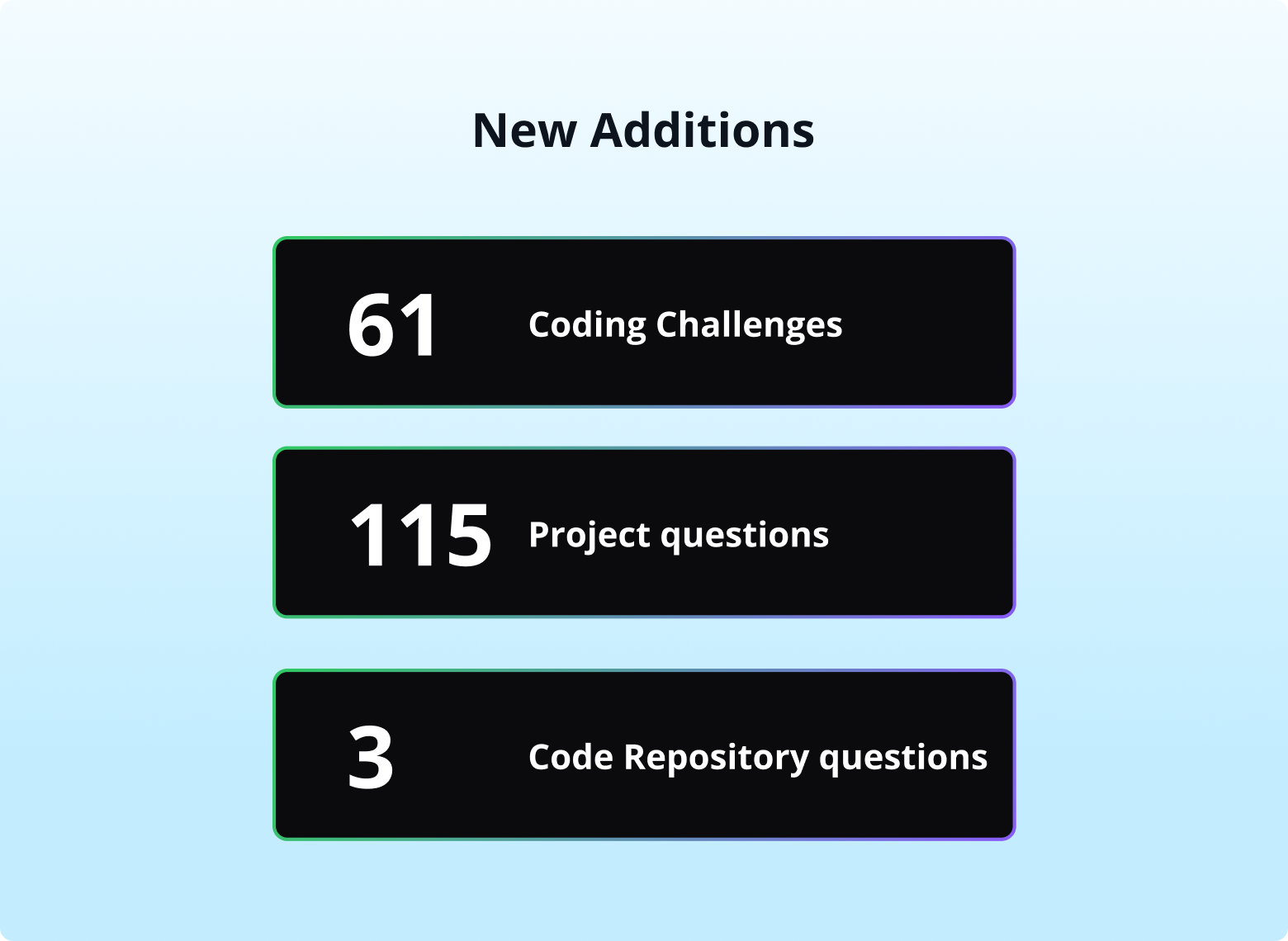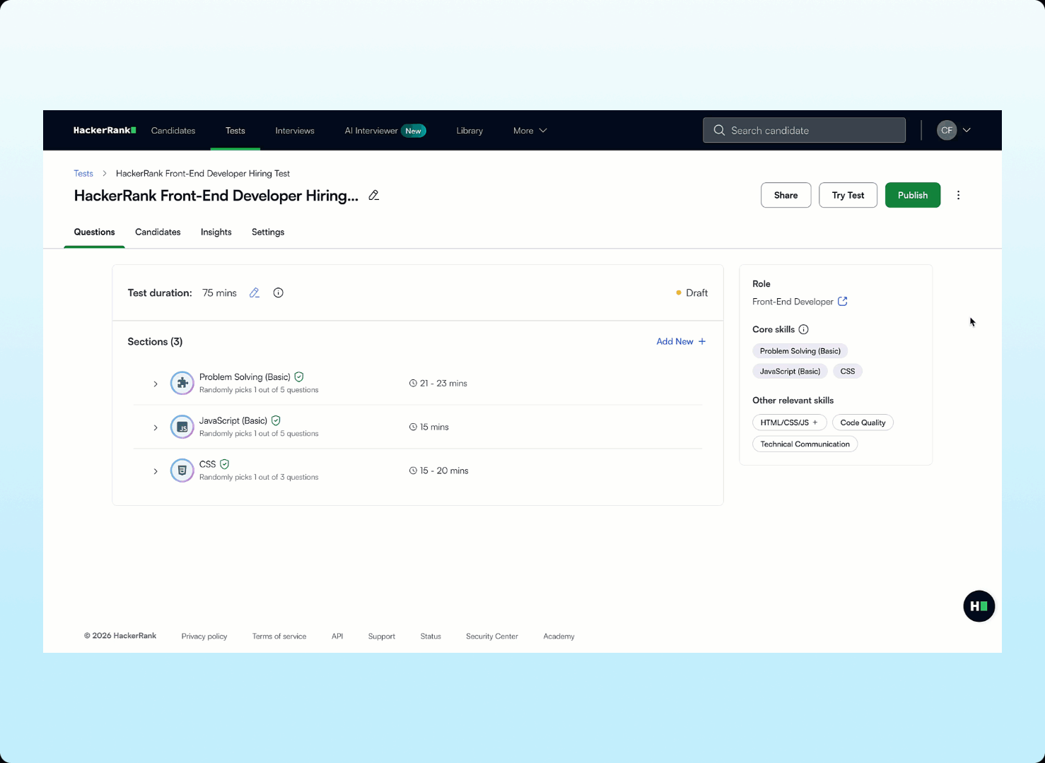 Find hundreds of new and refreshed questions that reflect role-specific tasks in the HackerRank Library. Assess candidates more accurately with real-world projects and code repository challenges, updated technologies, and clearer problem statements.