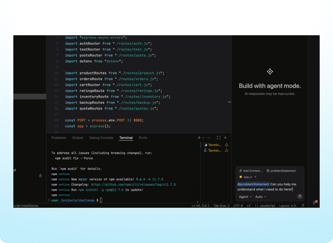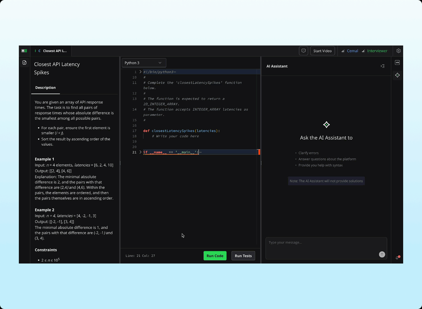 Work with an improved AI Assistant experience that loads faster and supports smoother checkpoint restores to quickly return to a previous state when needed. In interviews, candidates can now choose when to share the problem statement with the AI Assistant, making it easier to assess task understanding and how effectively AI is used.