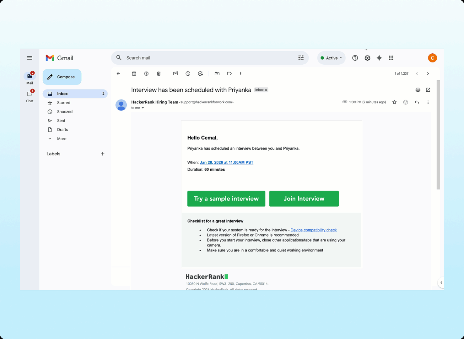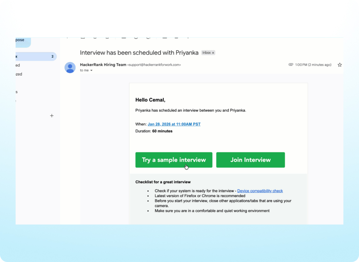 Candidates can now access a sample interview experience for Code Repo questions, consistent with existing previews for coding and whiteboard interviews. The experience supports multiple Code Repo tasks from the same repository, giving candidates a more realistic understanding of how Code Repo–based interviews work.