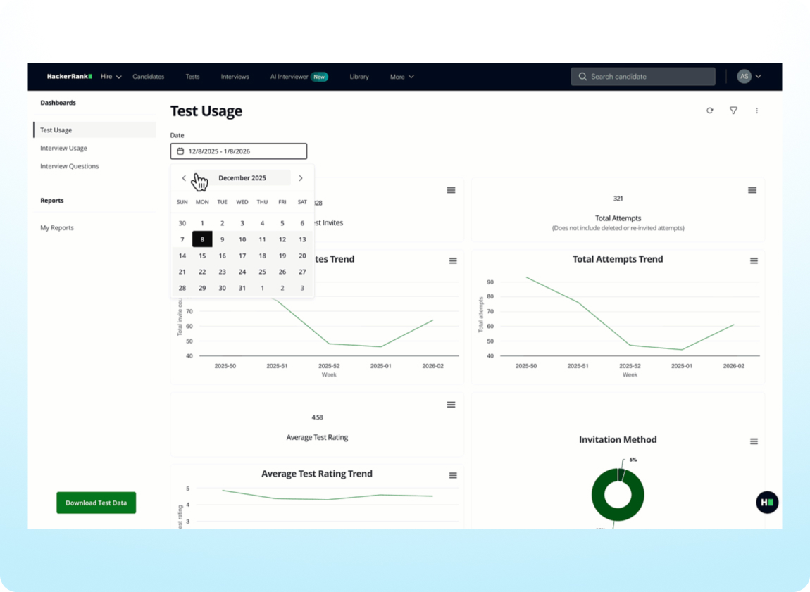 Custom Reports let you access and analyze your HackerRank data on demand. With advanced filtering, you can now drill into specific data segments, explore results in greater detail, and focus on the exact data you need when building and sharing reports.