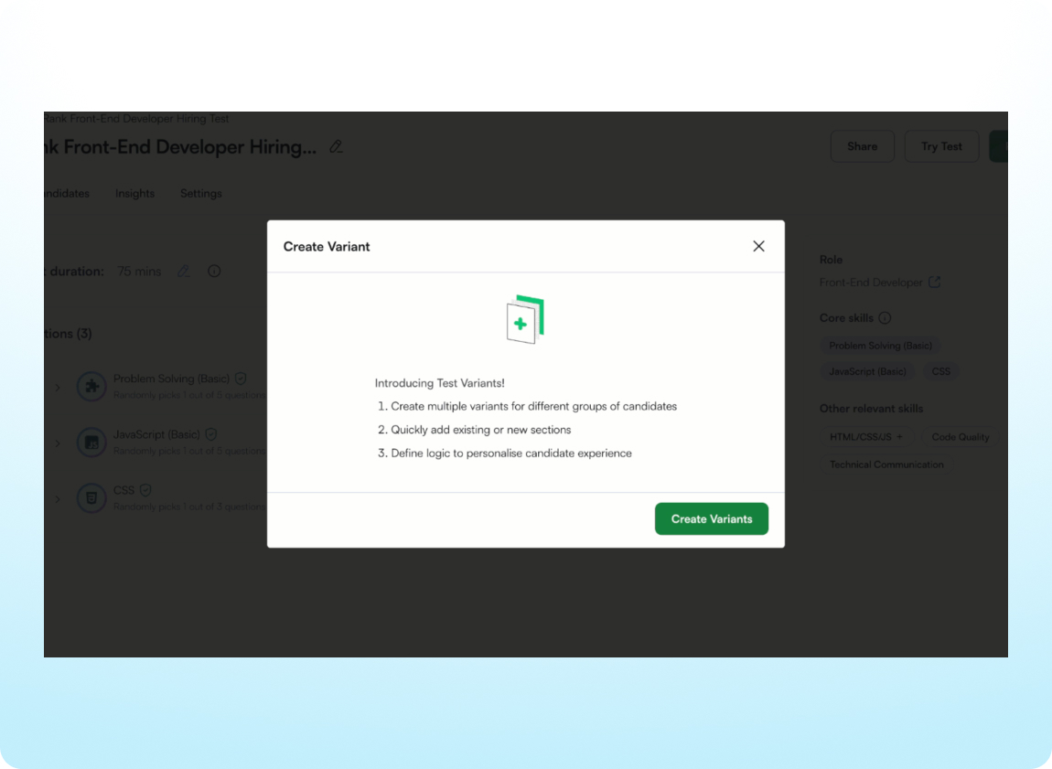 Creating and managing different versions of a test is easier with a redesigned setup flow that simplifies routing candidates to the right test based on a qualifying question. Plus, extra time accommodations can now be granted to candidates taking test variants.