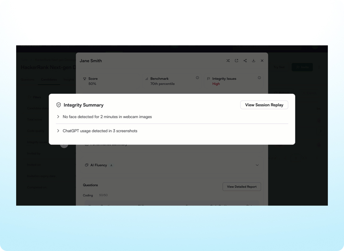 Get a consistent snapshot of candidate integrity in your Greenhouse, iCIMs, or Workday ATS through two synced data points: an Integrity Status (None, Medium, or High) and an Integrity Summary highlighting flagged behaviors such as copy and paste activity. Full integrity details and deeper context remain available in the HackerRank assessment report.
